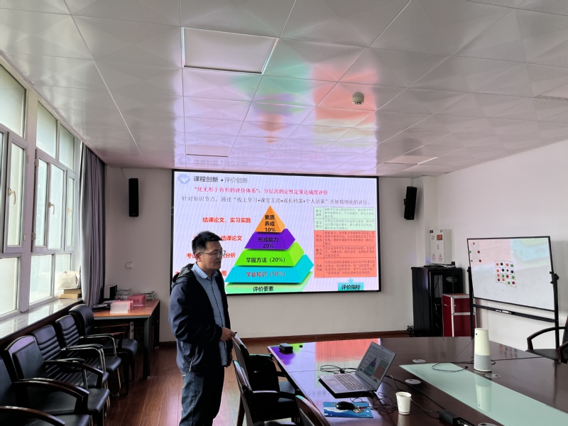 化学化工学院潘乐副教授以“内化于心,外化于行——《分析化学》课程思政教学探索与实践”为题,系统分享了课程建设的经验。他回顾了课程从1952年服务于农业、畜牧学科,到2003年独立设课,再到2016年启动课程思政建设、2023年获批校级思政示范课的发展历程。针对教学中的痛点,课程团队提出“强国有我,我要何为”的育人导向,通过“四融合”教学模式——马列理论与课程内容融合、职业技能与职业素养融合、理论与实践融合、专业与岗位融合,构建“入学即入职、上课即上岗”的沉浸式学习场景。课程围绕9大模块、110个知识点,开发了40个教学案例,对应50个思政要素,实现“知识中有案例、案例中有场景、场景中有岗位”的教学创新。课程实施以来,学生科技报国使命感显著增强,每年百余学生参与乡村振兴实践,在省级以上竞赛中获奖20余人次,多项大创项目获国家级支持。