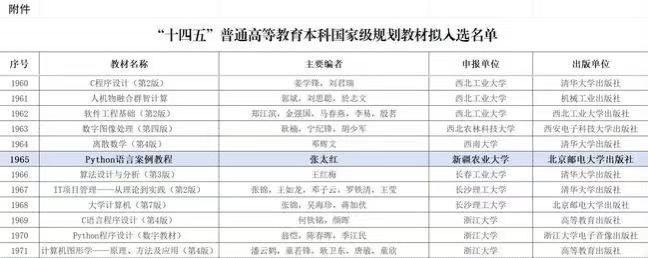 1月19日,教育部发布《关于“十四五”普通高等教育本科国家级规划教材拟入选名单的公示》,新疆农业大学计算机与信息工程学院院长张太红教授主编的《Python语言案例教程》成功入选,彰显了学校在计算机教育领域的教学实力与学科积淀,是学校在本科教材建设、学科专业内涵发展及人才培养质量提升等方面实现的新突破。